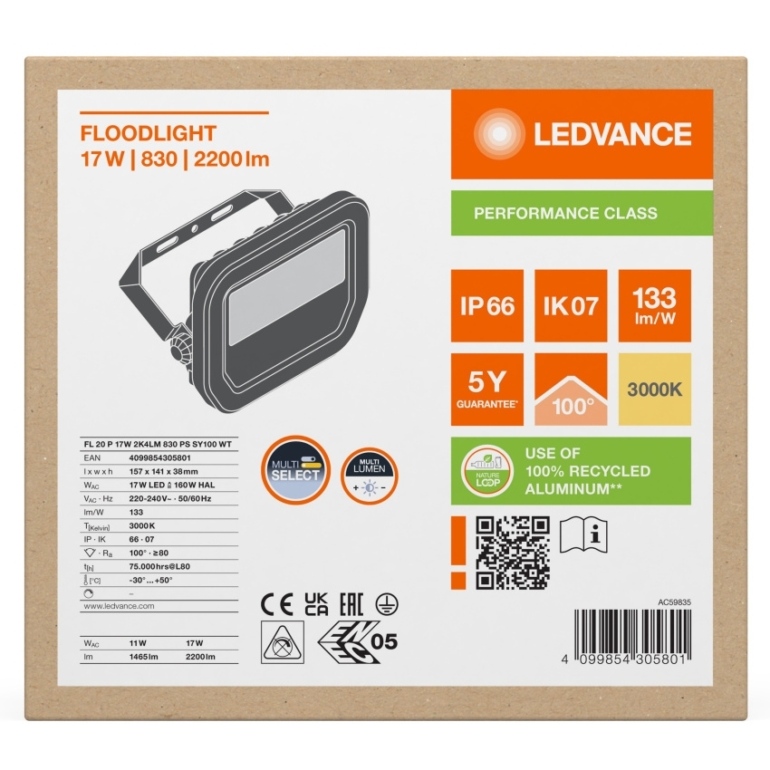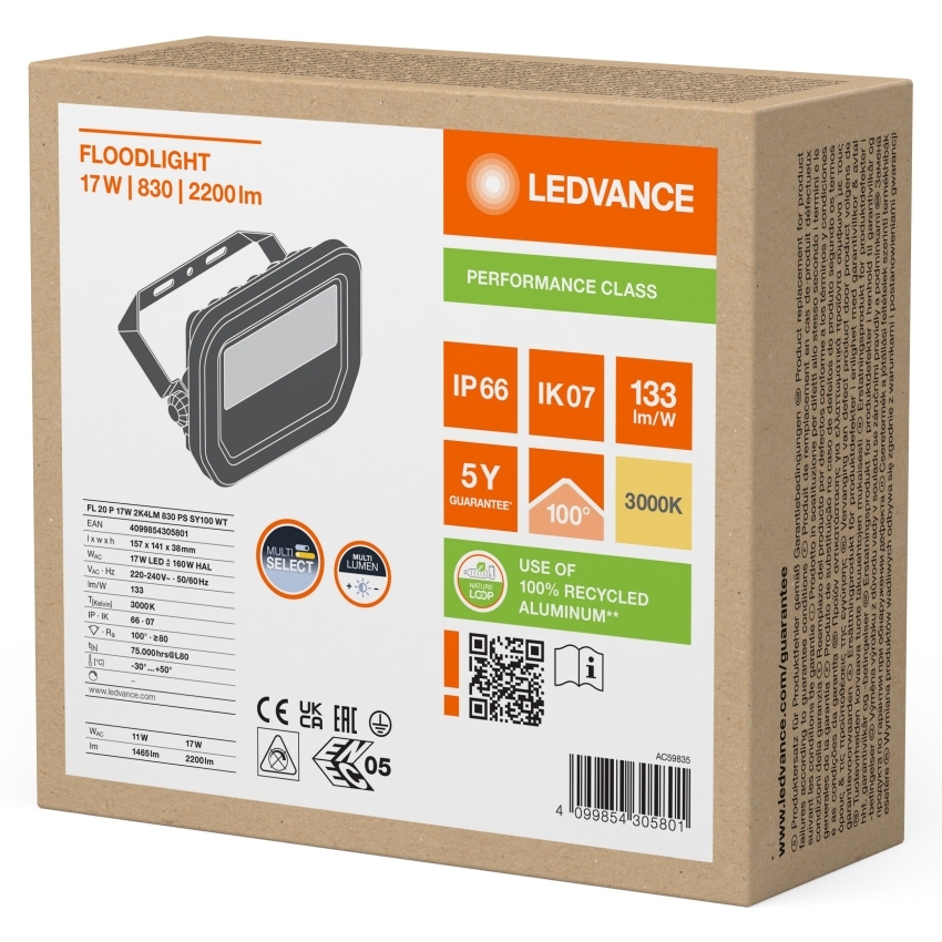 LEDVANCE SVÍTIDLO LED REFLEKTOR FL 20 P 11W/17W 1465LM/2200LM 3000K IP66 BÍLÁ