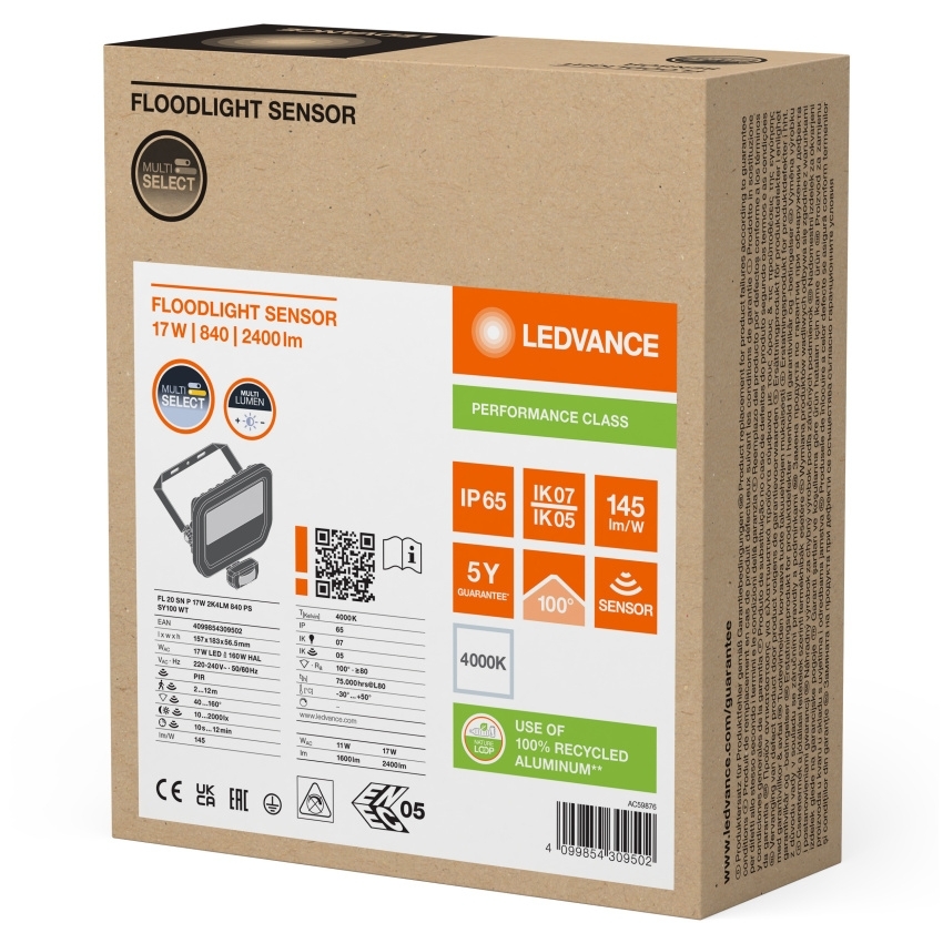 LEDVANCE SVÍTIDLO LED REFLEKTOR FL 20 SN P 11W/17W 1600LM/2400LM 4000K IP65 SENZOR BÍLÁ