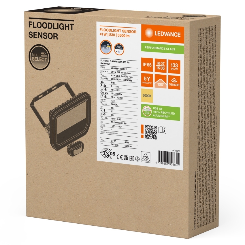 LEDVANCE SVÍTIDLO LED REFLEKTOR FL 50 SN 27W/41W 3670LM/5500LM 3000K PS SYM 100 SENZOR BÍLÁ