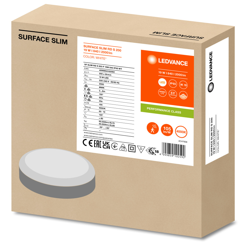 LEDVANCE SVÍTIDLO LED SF SLIM RD S 200 P 19W 840 4000K SENZOR IP65 PŘIS. KRUH.