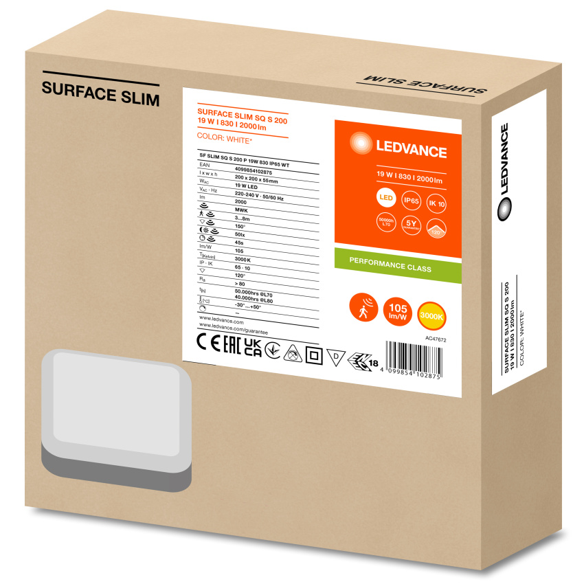 LEDVANCE SVÍTIDLO LED SF SLIM SQ S 200 P 19W 830 3000K SENZOR IP65 PŘIS. HRAN.