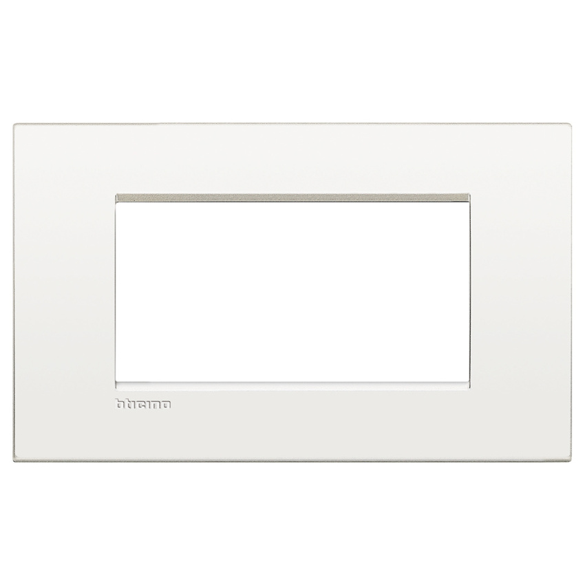 4-modulový hranatý rámeček. Provedení: jednobarevné (Zamak), barva bílá.