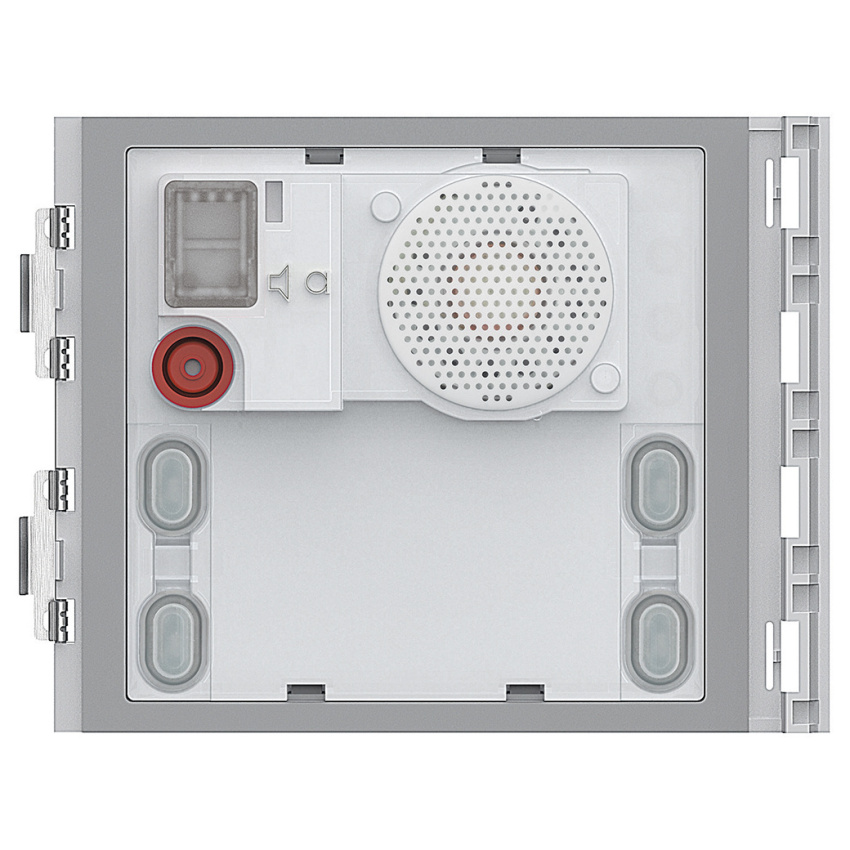 Audio jednotka - základní, 2vodičový systém. 4 volání, 1 modul. Audio jednotku pro sestavení audio panelu lze kombinovat s moduly 352000, 352100 a 352200. Signalizace funkce pomocí tónu. K panelu nelze připojit externí kameru pomocí konvertoru 347400.