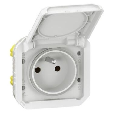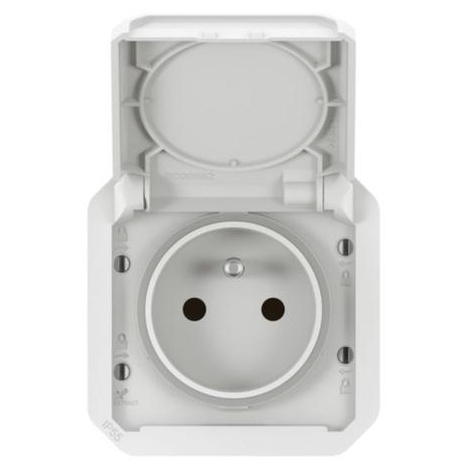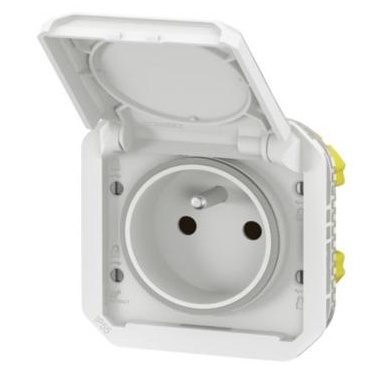 LEGRAND Plexo New 069621L je přístrojová zásuvka 2P+T v bílé barvě s dětskými clonkami, krytím IP55 a odolností IK08, vhodná do vlhkého či prašného prostředí.