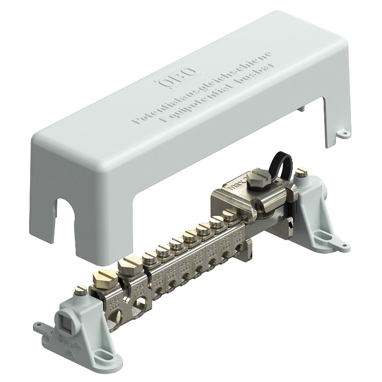 Lišta pro vyrovnání potenciálů podle DIN VDE 0100-410/-540 a ochrany před bleskem. S upínací lištou 10 x 10 mm z mosazi, poniklovaná. Kryt a montážní držáky vyrobené z šedého polystyrenu, svádí bleskový proud 100 kA (10/350) . Tažný třmen s šroubovým zámkem proti uvolnění (požadováno např. v průmyslu a nebezpečných oblastí). Konektivita: 7 jednolůžkových nebo laněných vodičů 2,5 - 25 mm2 nebo ohebné kabely do 16 mm2 (max. 7 mm). 2 jednolůžkové nebo laněné vodiče 25 až 95 mm2 nebo jemně vodič do 70 mm2 (max. průměr 13,5 mm), 1 x plochý vodič 30 3,5 mm.