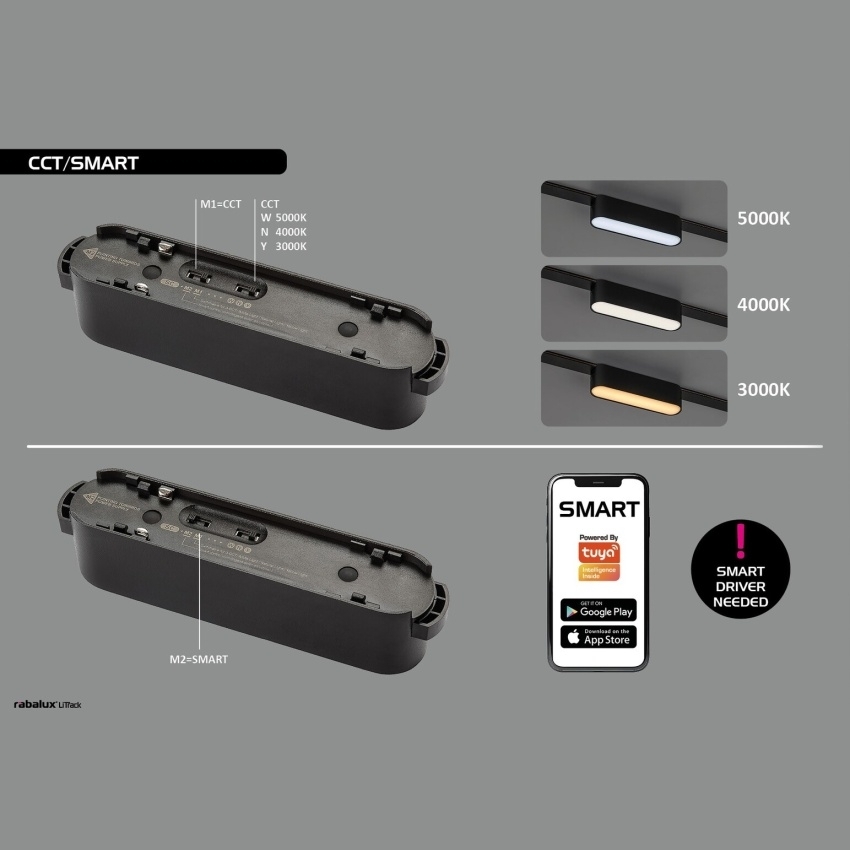 Kolejnicové svítidlo Rabalux LiTrack Line je osazeno integrovaným LED světelným zdrojem s příkonem 7 W a světelným tokem 370 lm. Umožňuje nastavení teploty chromatičnosti v rozsahu 2700 K až 5500 K, přičemž změna barvy světla je možná pomocí DIP přepínače nebo prostřednictvím aplikace v mobilním zařízení. Svítidlo je stmívatelné, pracuje s napětím DC 24 V, má stupeň krytí IP20 a je určeno pro použití v kolejnicovém systému.
