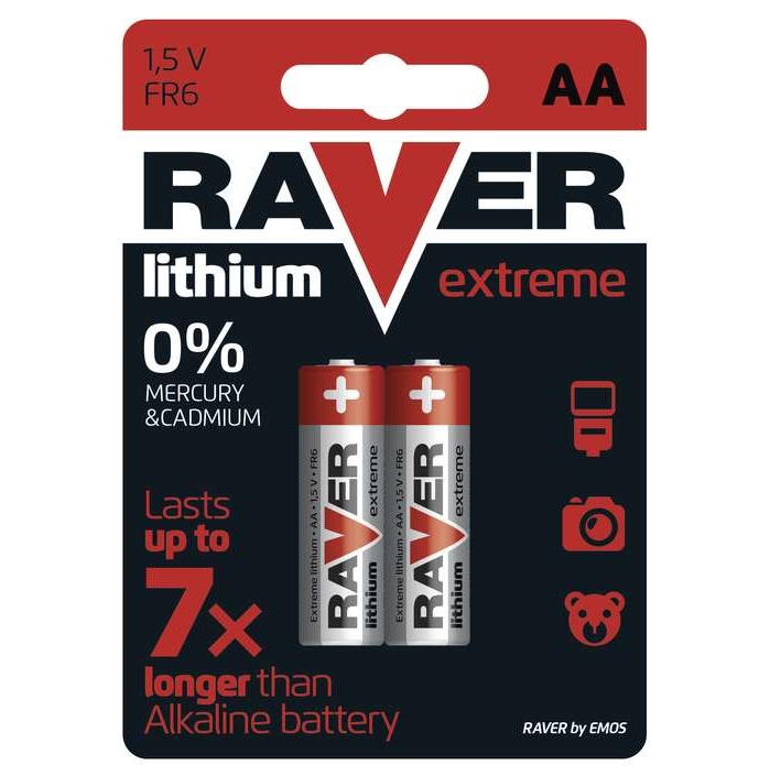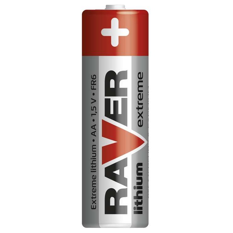 Tužková lithiová baterie RAVER velikosti AA (FR6). Baterie je vhodná pro zařízení s větším odběrem proudu např. fotoaparáty. Baterie má o 1/3 sníženou hmotnost a odolává extrémním teplotním podmínkám. Doba skladování baterie je nad 10 let. Využívá moderní technologie k maximální bezpečnosti baterie (obsahuje pojistku proti zkratu a přepólování).