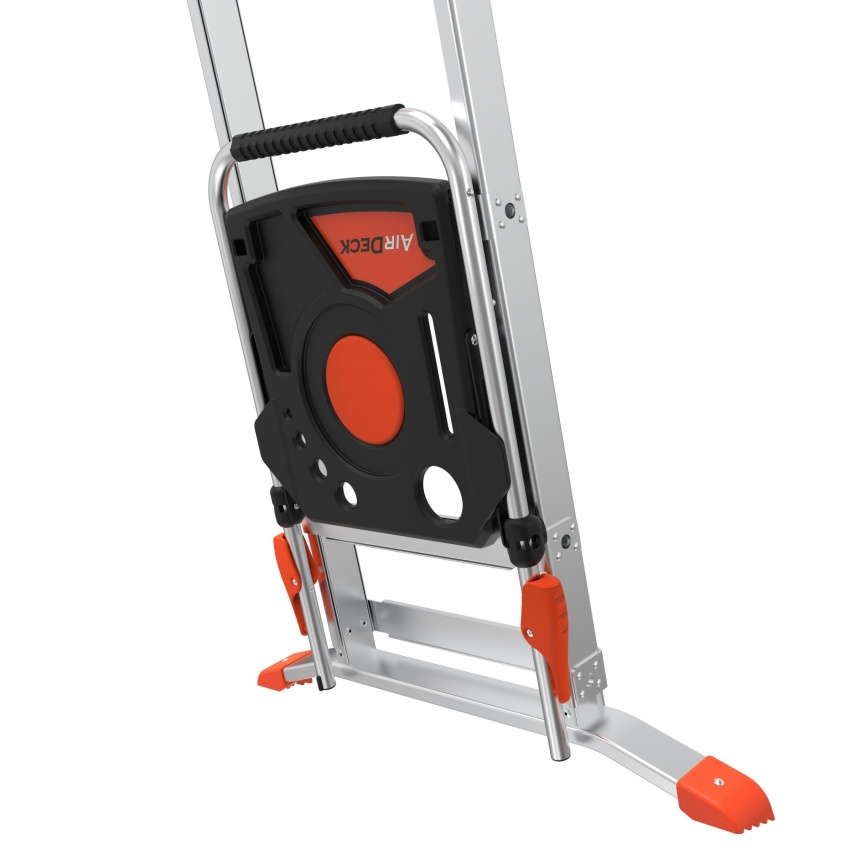 Vícepolohový výsuvný žebřík s upravitelnou výškou a konfigurací štafle, 90° pozice i jako žebřík na schody. Včetně organizéru na nářadí AirDeck
