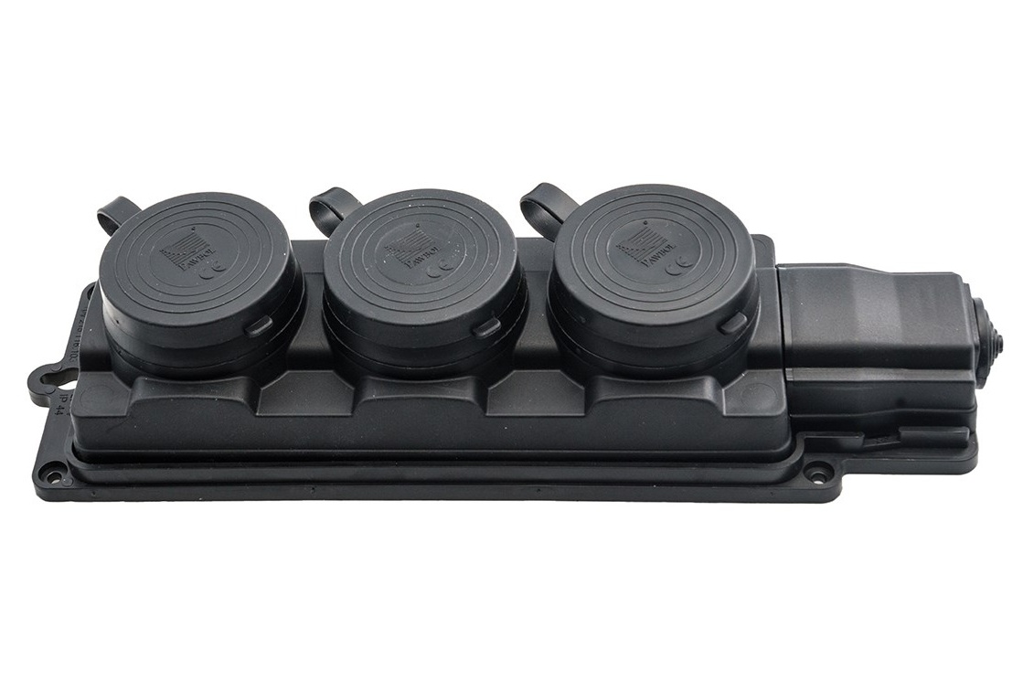 Zásuvka gumová 3-násobná 16A/250V, IP44, černá.