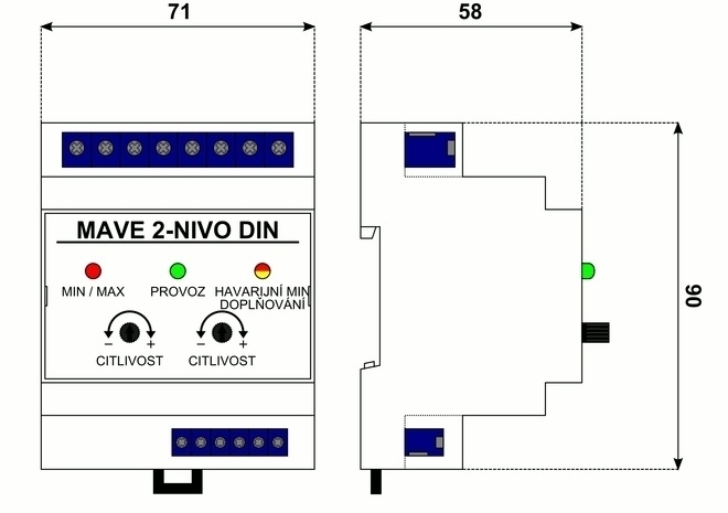 Snímání a regulace hladiny vody v kotlích. Náhrada snímače hladiny NIVOCONTROL. Snímače hladiny MAVE 2 NIVO se vyrábějí v provedení pro vnější montáž nebo pro montáž do rozvaděče na DIN lištu 35 mm (označení DIN). Ke snímačům MAVE 2 NIVO je určena snímací Tlaková vodivostní sonda NIVO s přírubou DN100 a příslušenstvím.
