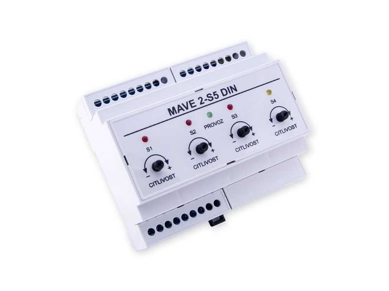 Snímač MAVE 2-S5 DIN spojuje tři snímače MAVE 2-S1 (snímání minimální nebo maximální hladiny) a jeden MAVE 2-S2 (doplňování nebo vyčerpávání s diferencí danou vzdáleností snímacích sond). Popis: