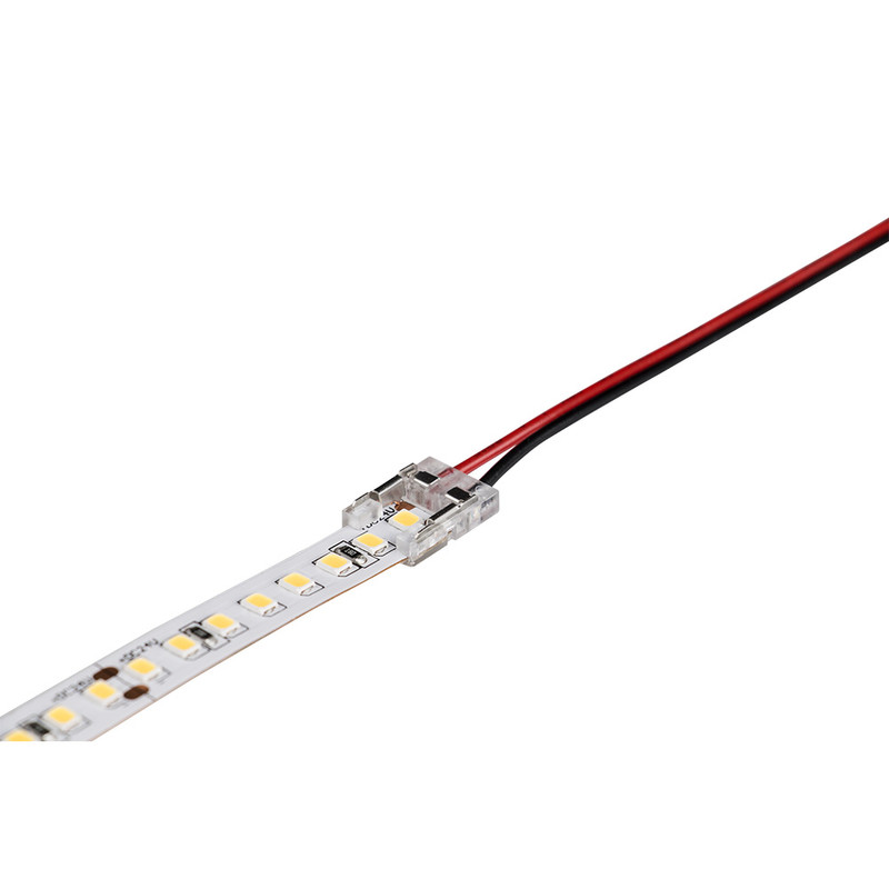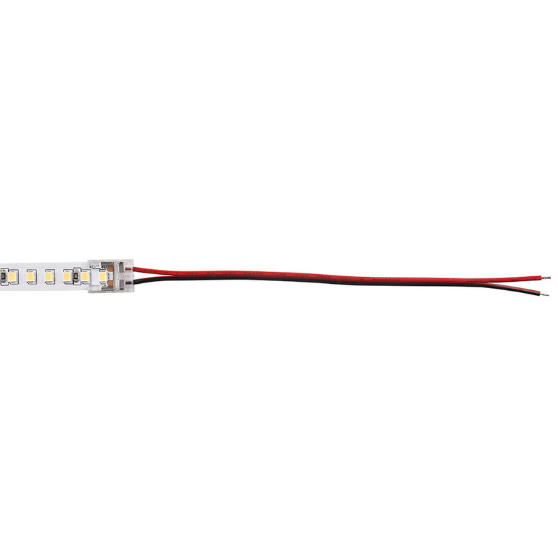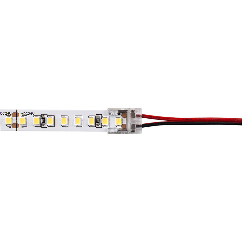 McLED Připojovací konektor jednobarevných LED pásků šíře 10 mm, 2 piny. Konektor využijete ke snadnému propojení LED pásků s řízením, nebo napájecími zdroji s výstupní svorkovnicí. Konektor lze použít na LED pásky s jakýmkoli počtem LED/m, pásek se zasune do konektoru a konektor zafixuje kleštěmi. Doporučujeme pro max. proud 3,5 A, pro větší proudy je třeba vodiče k LED pásku připájet. Rozměry plastové části:11,7 (š) x 15,6 (d) x 3,3 (v) mm, celková délka cca 160 mm. Kabel: barva červená, černá, velikost AWG20/0,5 mm2.