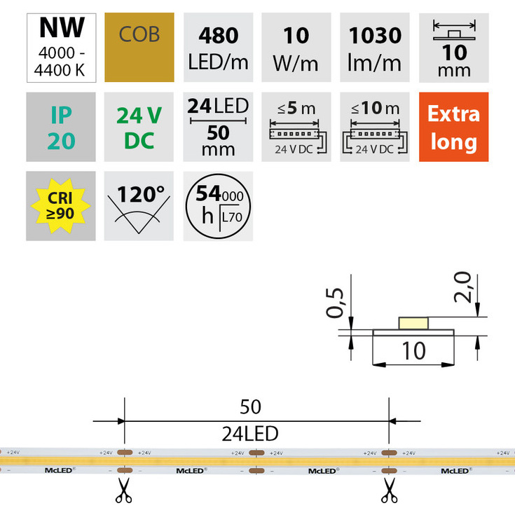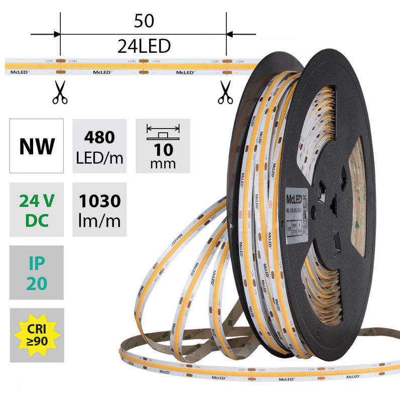 MCLED LED PÁSEK COB NW 10W/480LED/1030LM 24VDC CRI90 IP20 Š. 10MM 50M ML-126.054.83.2