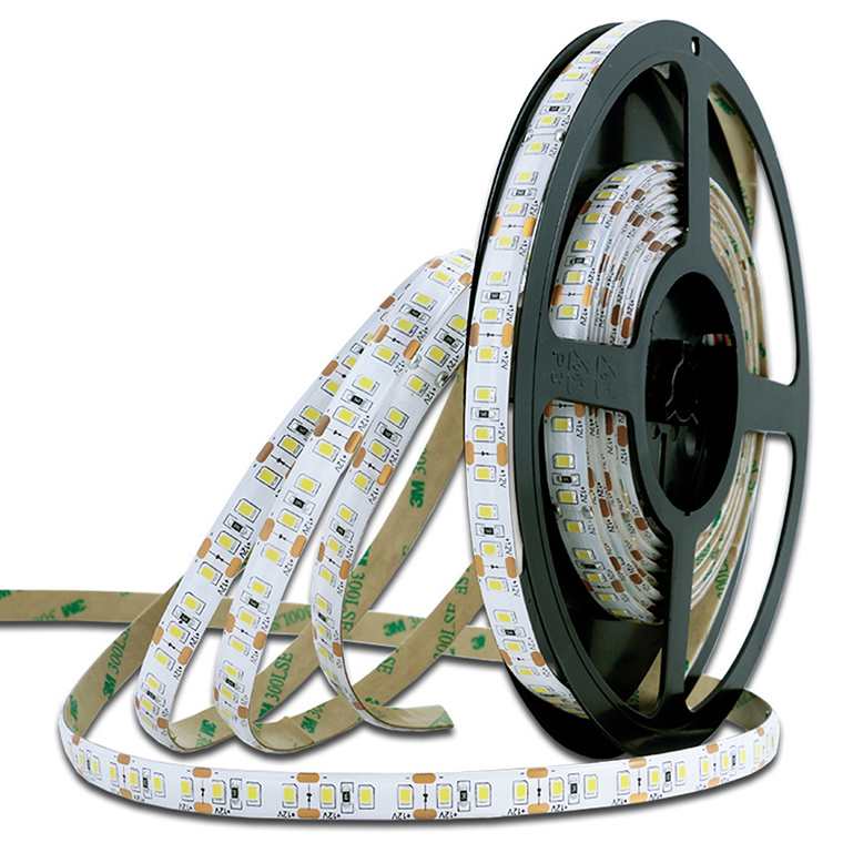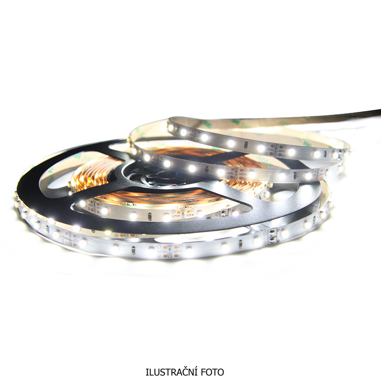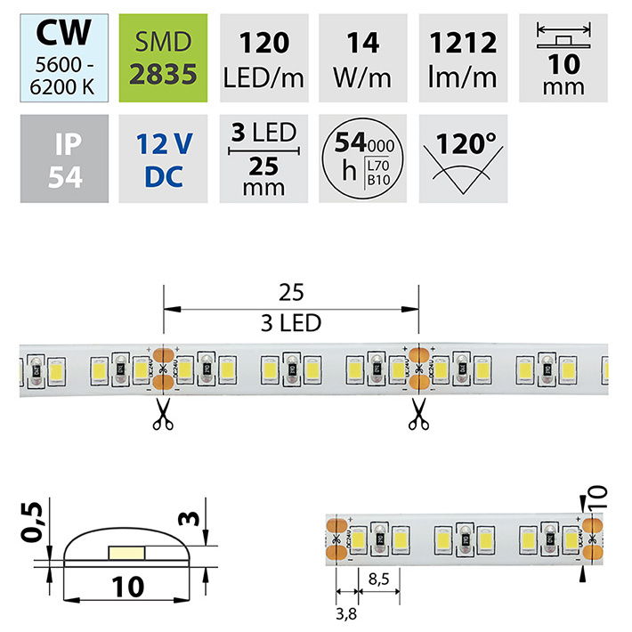 LED pásek SMD2835, 5600-6200K (studeně bílý CW), 14W, 120LED, 1212lm/m, segment 50mm, 3LED/segment, IP54, DC 12V, životnost 54000h, šíře 10mm, bílý PCB pásek, max. délka pásku při jednostranném zapojení: 5m, opatřen samolepící páskou 3M, UV stabilní. Balení 5m.