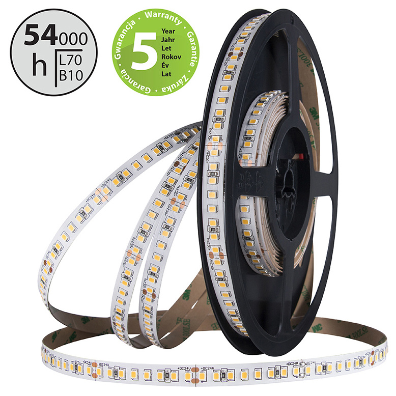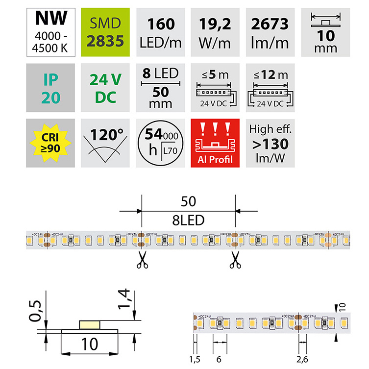 LED pásek SMD2835, neutrální bílá (4200K), 19,2 W, 160 LED, 2673 lm/m, CRI>90, segment 50 mm, 8 LED/segment, IP20, DC 24V, životnost 54000 h, šíře 10 mm, bílý PCB pásek, max. délka pásku při jednostranném zapojení: 5 m, opatřen samolepící páskou 3M, UV stabilní.