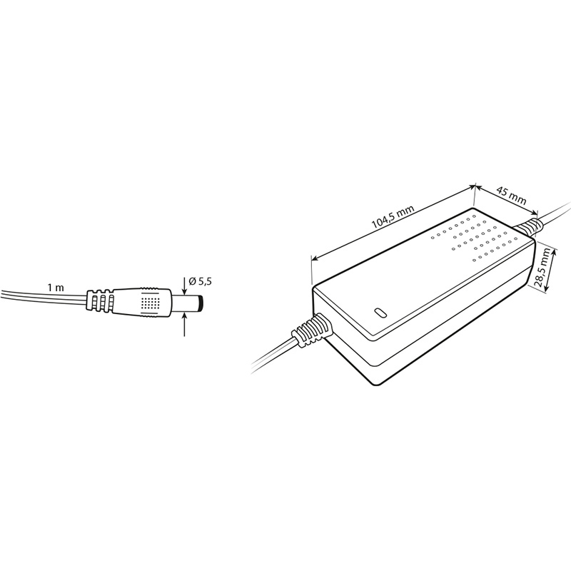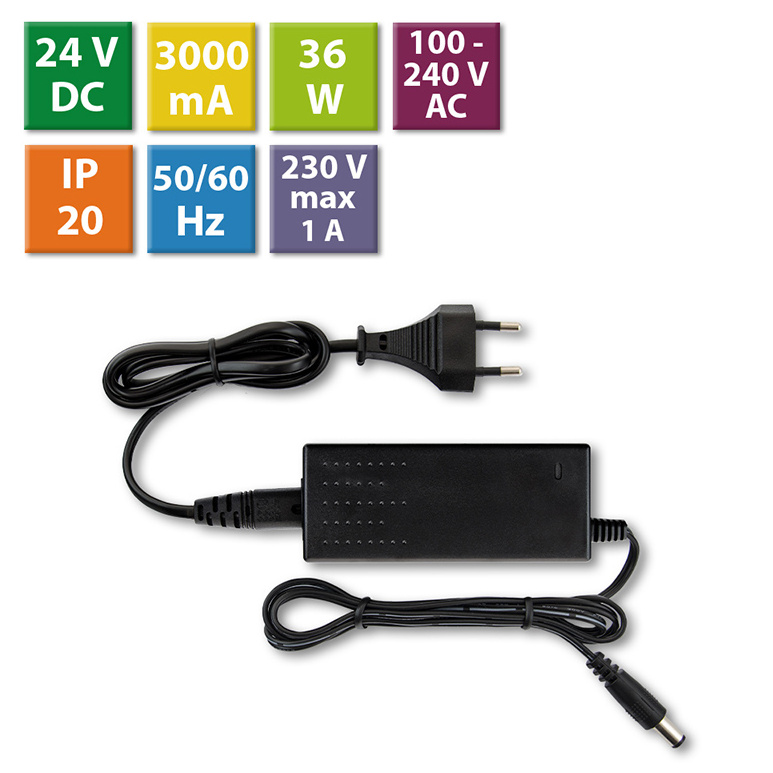 LED napěťový zdroj pro LED pásky 36 W, výstup DC 24V/1,5A. IP20. Pro připojení do zásuvky. Vstupní napětí 100 - 240V AC, materiál krytu: plast, barva: černá. Rozměry 104,5x45x28,5 mm, hmotnost 0,23 kg. Zdroj SELV, certifikáty: CE, RoHS. Při výběru zdroje počítejte s výkonovou rezervou min. 20 %.