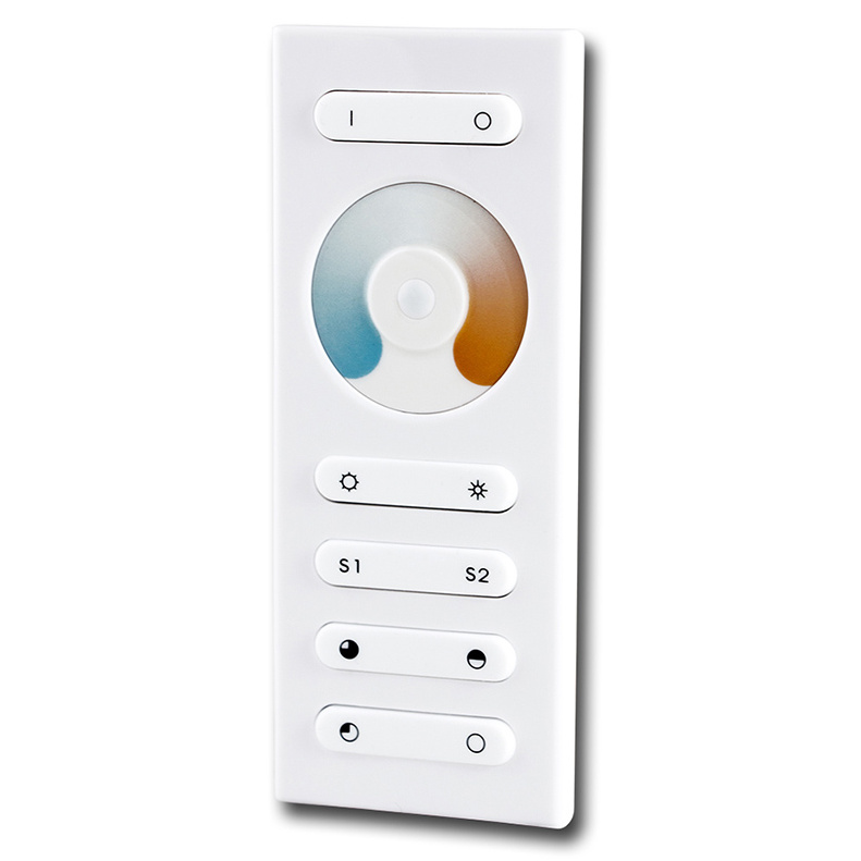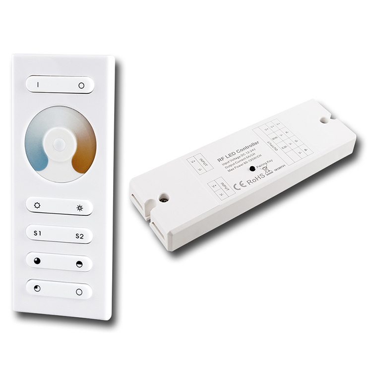 RF dálkové ovládání pro řízení jasu a teploty bílé u double white LED pásků (dosah až 20 m), 1 zóna. Možnost uložit aktuální nastavení teploty bílé a jasu pod scény (S1, S2). Rozměry ovladače: 120×48×17,6 mm (napájení 3 x AAA baterie - nejsou součástí), přijímače: 145×46,5×16 mm. Max. zátěž: 120 W/12V, 240 W/24V.