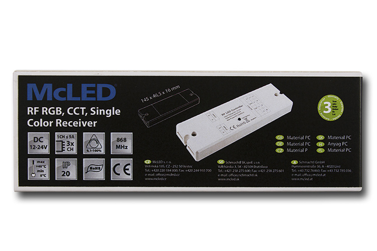 McLED Přijímač k dálkovému RF ovladači pro řízení jasu (stmívání) jednobarevných LED pásků, řízení RGB LED pásků a změnu teploty chromatičnosti CCT = double white LED pásků (RF ovladač není součástí). Rozměry: 145 x 46,5 x 16mm. Vstupní napětí: DC 12-24V. 3 kanály s max. zátěží 5A na 1 kanál (R/G/B = 3 kanály), celková zatížitelnost 120W/12V, 240W/24V. Po výpadku napájení si pamatuje poslední nastavenou hodnotu/režim. Každý přijímač může být ovládán max. 8 různými ovladači.