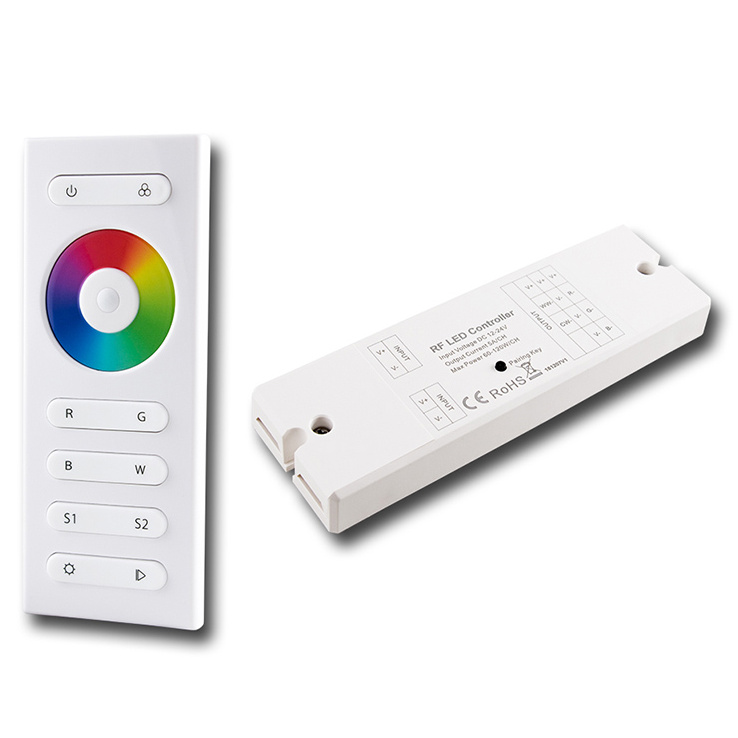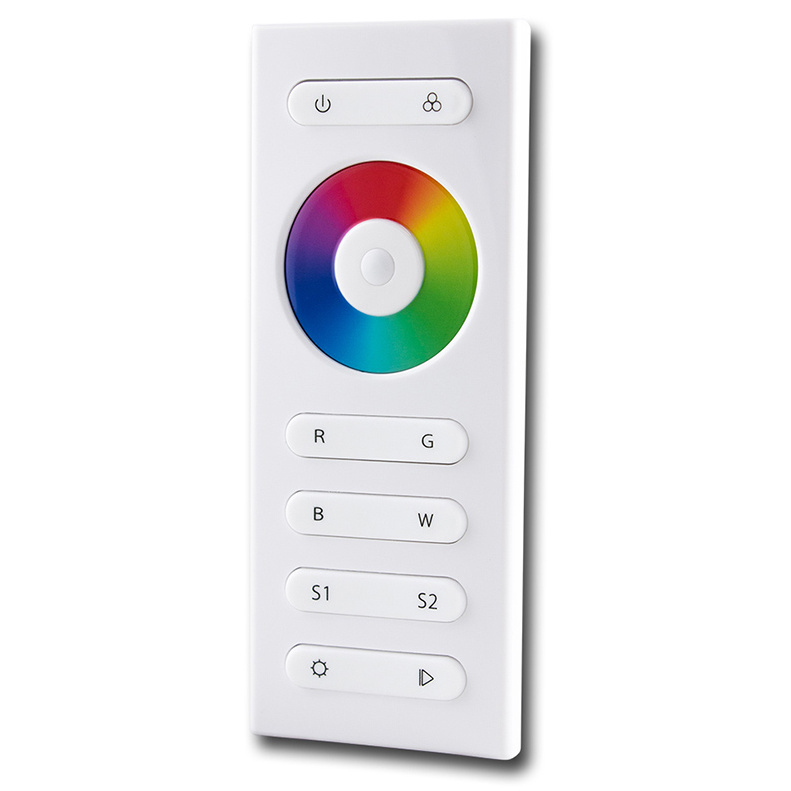 RF dálkové ovládání pro řízení jasu, barev a režimů u RGBW LED pásků (dosah až 20 m). Předprogramováno 10 barevných režimů, možnost nastavit rychlost efektu. Rozměry ovladače: 120×48×17,6mm (napájení 3xAAA baterie - nejsou součástí), přijímače: 145×46,5×16mm. Max. zátěž: 120W/12V, 240W/24V.