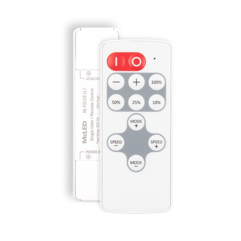 McLED Sada RF dálkového ovládání pro řízení jasu jednobarevných LED pásků (dosah až 15 m), 1 zóna. LED indikace funkce, zabudované ochrany proti přehřátí, přetížení, zkratu. 8 módů blikání, pohasínání + 10 rychlostí. Rozměry ovladače: 87×24×15mm (napájení 1xCR2032 baterie - je součástí balení), přijímače: 87×24×15mm. Max. zátěž: 10A (120W/12V, 240W/24V). DC5-24V. Magnetický držák na ovladač součástí balení.