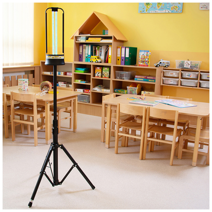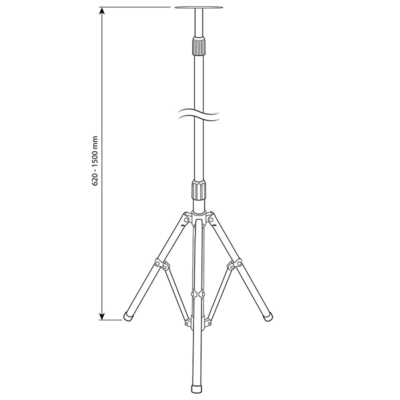 Výškově nastavitelný stativ pro dezinfekční lampu UVC-Protect, plynule nastavitelná výška od 620 mm do 1500 mm, rozměry složeného stavu ø 150x660 mm, materiál kov, černá, součástí balení kruhová podstava pod lampu a sada samolepících suchých zipů pro upevnění lampy k podstavě.