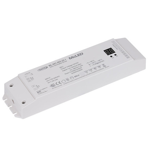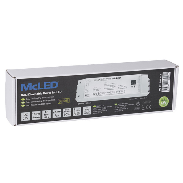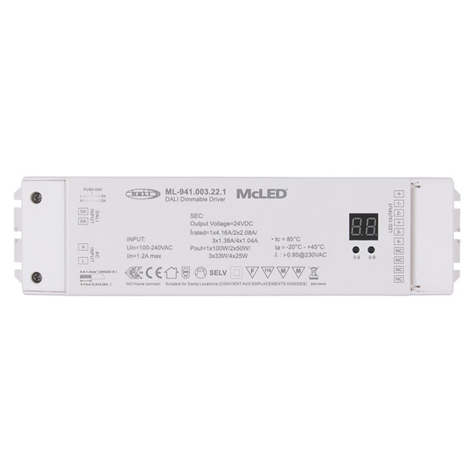 McLED Stmívatelný napěťový zdroj pro LED pásky - výkon 100W, výstupní napětí DC 24V, proud max. 4,16A. IP20. 4 výstupní kanály (RGBW). Vstupní napětí 100 - 240V AC, materiál krytu: plast. Rozměry 244x64x32mm, hmotnost 450g. Stmívání pomocí DALI nebo tlačítkem. Při výběru zdroje počítejte s výkonovou rezervou min. 20%. Doba náběhu cca 0,5 - 2s. Certifikace: CE, ENEC, SELV, F, MM.