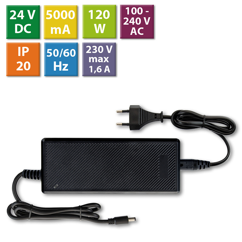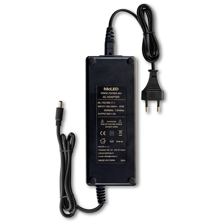 LED napěťový zdroj pro LED pásky 120 W, výstup DC 24V/5A. IP20. Pro připojení do zásuvky. Vstupní napětí 100 - 240V AC, materiál krytu: plast, barva: černá. Rozměry 172x71x42,2 mm, hmotnost 0,75 kg. Zdroj SELV, certifikáty: CE, RoHS. Při výběru zdroje počítejte s výkonovou rezervou min. 20 %.