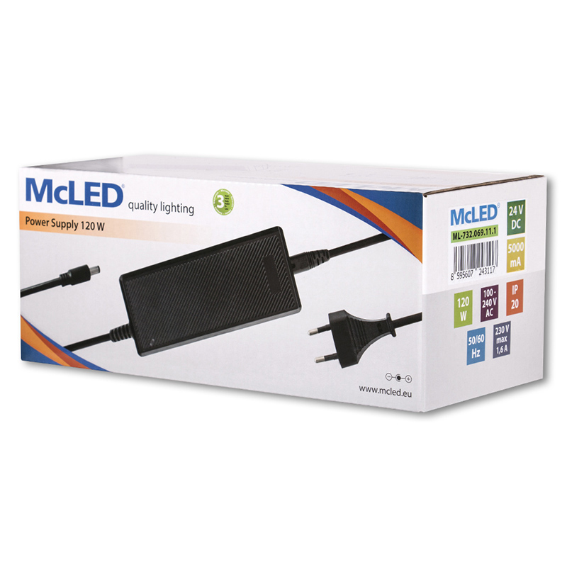 MCLED ZDROJ NAPÁJ. 120W 24VDC 5A IP20 ČERNÝ PLAST S VIDLICÍ ML-732.069.11.1