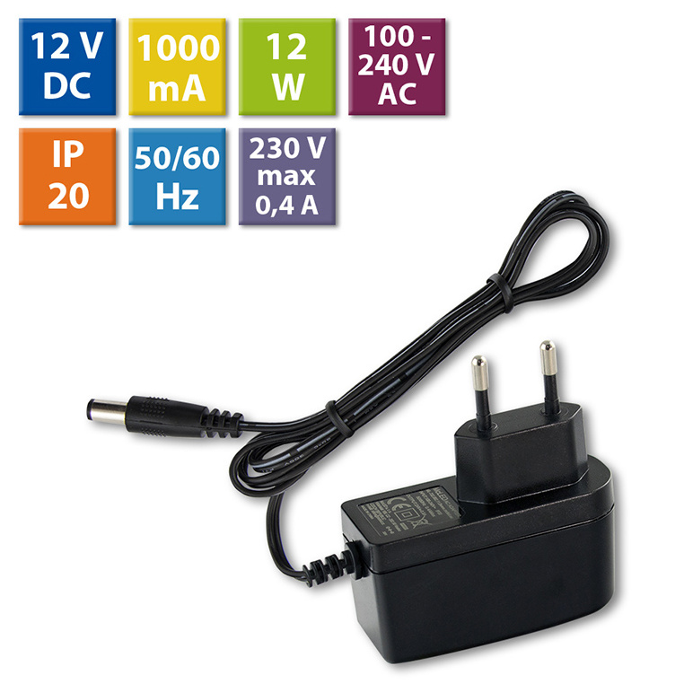 LED napěťový zdroj pro LED pásky 12 W, výstup DC 12V/1A. IP20. Pro připojení do zásuvky. Vstupní napětí 100 - 240V AC, materiál krytu: plast, barva: černá. Rozměry 75x69x27,5 mm, hmotnost 0,07 kg. Zdroj SELV, certifikáty: CE, RoHS. Při výběru zdroje počítejte s výkonovou rezervou min. 20 %.