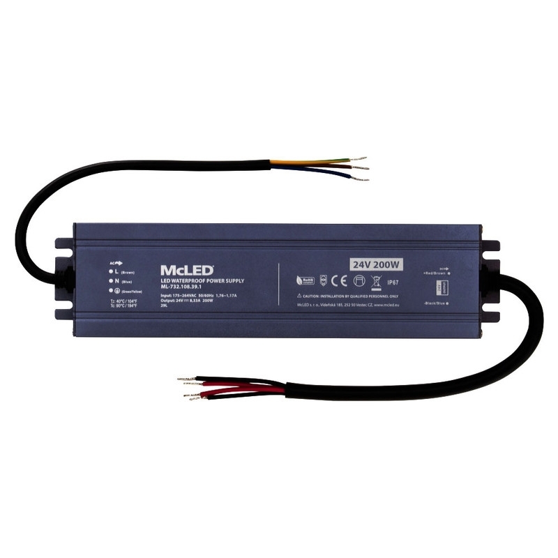 McLED Zdroj konstantního napětí, výkon 200W, krytí IP67, výstup: 24VDC, max. 8,33A. Vstup: 175-264VAC, 50-60Hz, materiál krytu: hliník. Rozměry: 238x62x34mm, hmotnost: 794g. Zdroj SELV. Při výběru zdroje počítejte s výkonovou rezervou min. 20%.