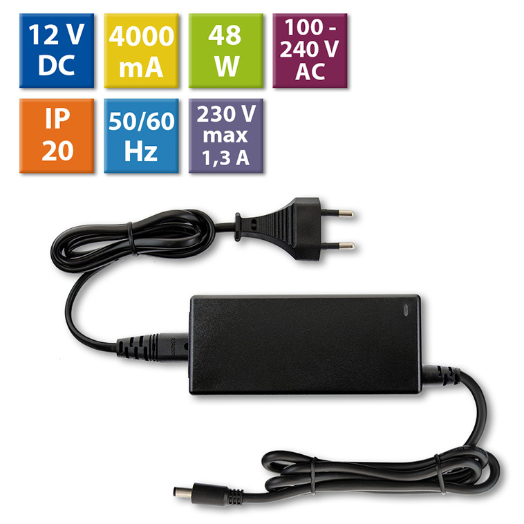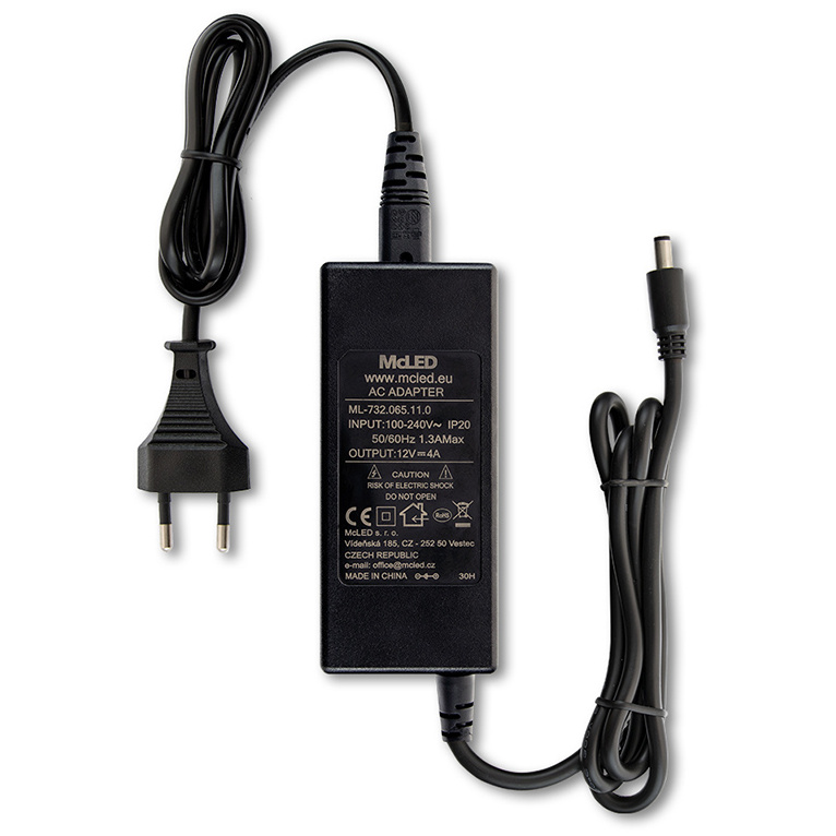 LED napěťový zdroj pro LED pásky 48W, výstup DC 12V/4A. IP20. Pro připojení do zásuvky. Vstupní napětí 100 - 240 V AC, materiál krytu: plast, barva: černá. Rozměry 115,7x51,5x32,5 mm, hmotnost 0,32 kg. Zdroj SELV, certifikáty: CE, RoHS. Při výběru zdroje počítejte s výkonovou rezervou min. 20%.