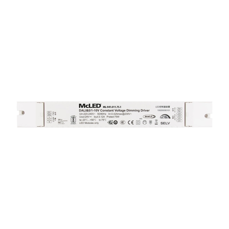 McLED Stmívatelný napěťový zdroj pro LED pásky - výkon 75W, výstupní napětí DC 24V, proud max. 3,12A. IP20. Vstupní napětí 200 - 240V AC, materiál krytu: plast. Rozměry 295x40x32mm, hmotnost 340g. Stmívání pomocí DALI nebo tlačítkem. Při výběru zdroje počítejte s výkonovou rezervou min. 20%. Doba náběhu cca 0,5 - 2s. Certifikace: CE, ENEC, SELV, F, MM.
