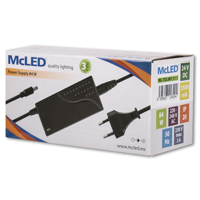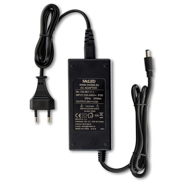 LED napěťový zdroj pro LED pásky 84 W, výstup DC 24V/3,5A. IP20. Pro připojení do zásuvky. Vstupní napětí 220 - 240V AC, materiál krytu: plast, barva: černá. Rozměry 115,3x56x34,4 mm, hmotnost 0,37 kg. Zdroj SELV, certifikáty: CE, RoHS. Při výběru zdroje počítejte s výkonovou rezervou min. 20 %.