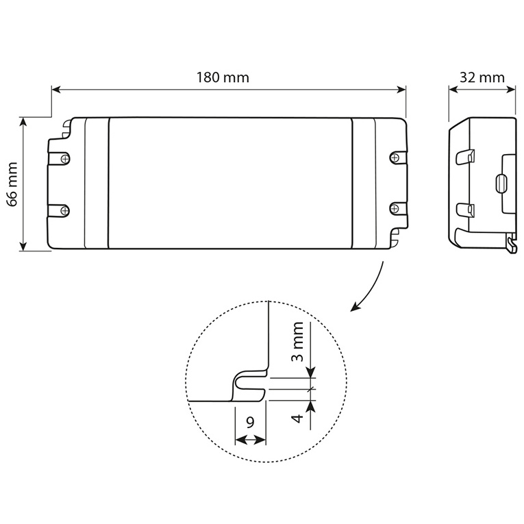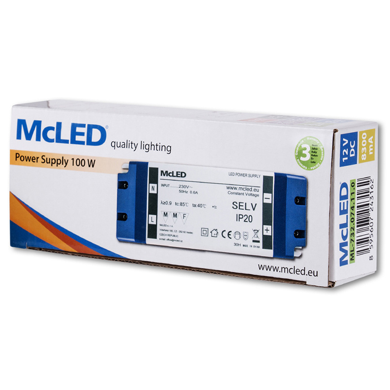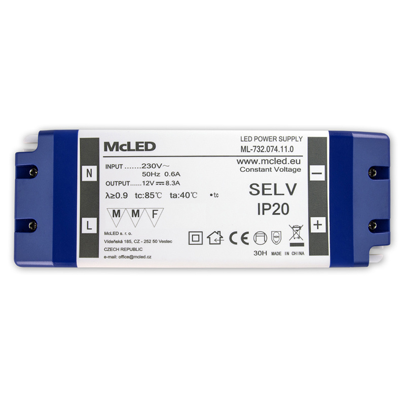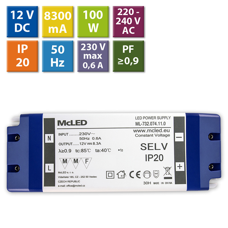 LED napěťový zdroj pro LED pásky 100 W, výstup DC 12V/8,3A. IP20. Vstupní a výstupní svorkovnice. Vstupní napětí 220 - 240V AC, materiál krytu: plast, barva bílá. Rozměry 180x66x32 mm, hmotnost 0,35 kg. Zdroj SELV, certifikáty: CE, RoHS, MM, F. Při výběru zdroje počítejte s výkonovou rezervou min. 20 %.