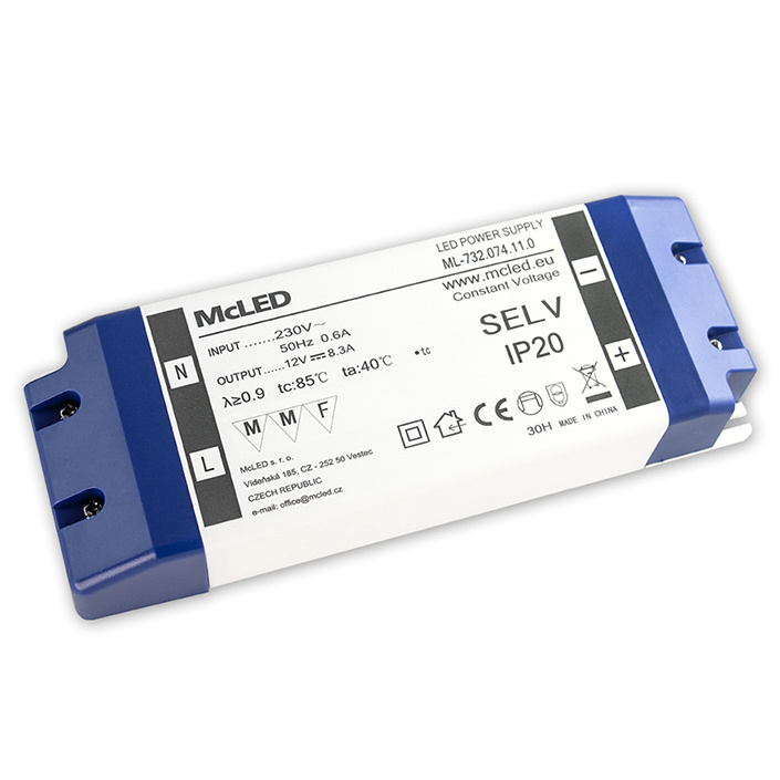 MCLED ZDROJ NAPÁJ. 100W DC12V/8,3A IP20 PLASTOVÉ PROVEDENÍ SE SVORKOVNICÍ ML-732.074.11.0