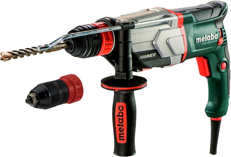 Kombinované kladivo KHE 2660 s výměnným sklíčidlem Metabo Quick Kladivo METABO k vrtání s příklepem (i bez) a lehkému sekání Systém výměnných sklíčidel Quick pro rychlou výměnu sklíčidla Bezpečnostní západková spojka zabraňující protočení při zaseknutí Nižší hmotnost a kompaktnější provedení zajištuje dobrou ovladatelnost Kryt převodu z hliníkového tlakového odlitku pro optimální odvod tepla a stabilitu Rukojeť s gumovou povrchovou vrstvou: redukce vibrací, pohodlná a bezpečná Ochranná mřížka vinutí Metabo brání vniknutí cizích abrazivních částic do motoru Nastavitelná rychlost otáček Vario (V) pro uzpůsobení dle typu činnosti a materiálu SDS Plus kladivo KHE 2660 Quick je vhodné i pro náročné profesionální využití Součástí dodávky Přídavná rukojeť, hloubkový doraz, výměnné sklíčidlo SDS-plus, příruční kufr