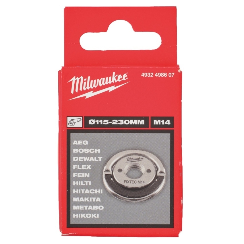 Univerzální matice MILWAUKEE® FIXTEC M14 je určena pro všechny úhlové brusky s průměrem kotouče od 115 do 230 mm. Umožňuje rychlou výměnu kotouče bez použití nářadí za pouhých 12 sekund, což šetří čas a usnadňuje práci. Díky tloušťce pouhých 8 mm poskytuje lepší využití kotouče a snadné použití v omezených prostorech. Integrované otvory na klíče umožňují demontáž matice standardním klíčem v případě nadměrného utažení během provozu. Je ideální pro brusky s automatickým nebo rychlým brzdným systémem.