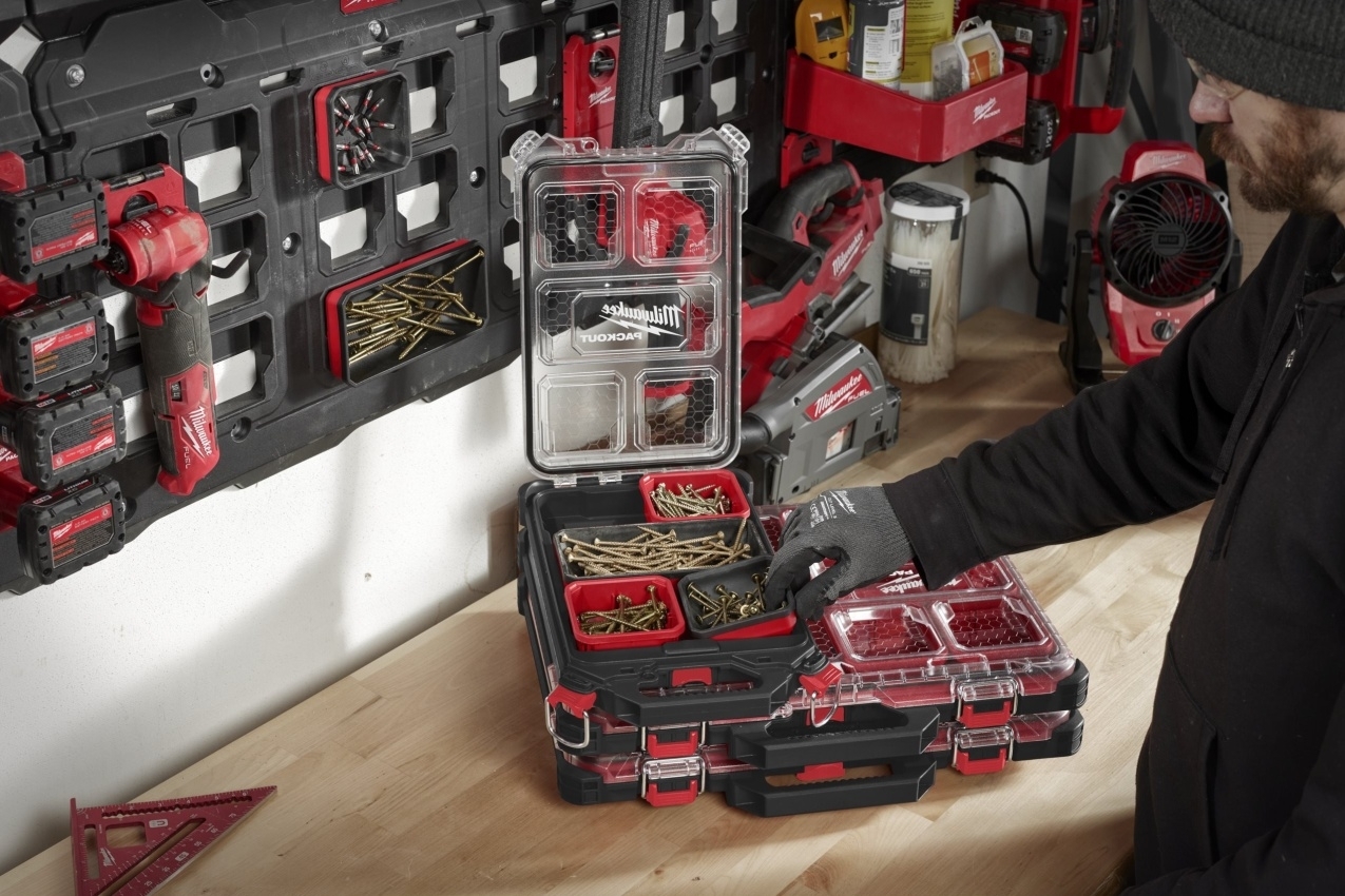 - Součást sortimentu PACKOUT™ pro skladování v dílně.