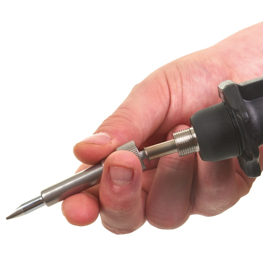 - Led dioda dvou barev upozorňuje uživatele: Při blikání zelenou barvou se nástroj zahřívá, při spojitém zeleném světle je připraven k provozu, červené světlo svítí, když je nástroj vypnutý, ale špička je horká, dokud červená nezhasne.