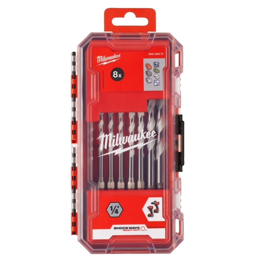 Sada univerzálních vrtáků Milwaukee Multi Material (4932493872) obsahuje 8 kusů vrtáků o průměrech 4 až 10 mm. Tyto víceúčelové vrtáky jsou vybaveny hroty s karbidem wolframu (TCT), což umožňuje efektivní vrtání do různých materiálů, jako jsou beton, cihly, střešní tašky, pórobetonové bloky, plechy, hliník, měkké a středně tvrdé keramické obklady, všechny typy dřeva a PVC. Sada obsahuje: