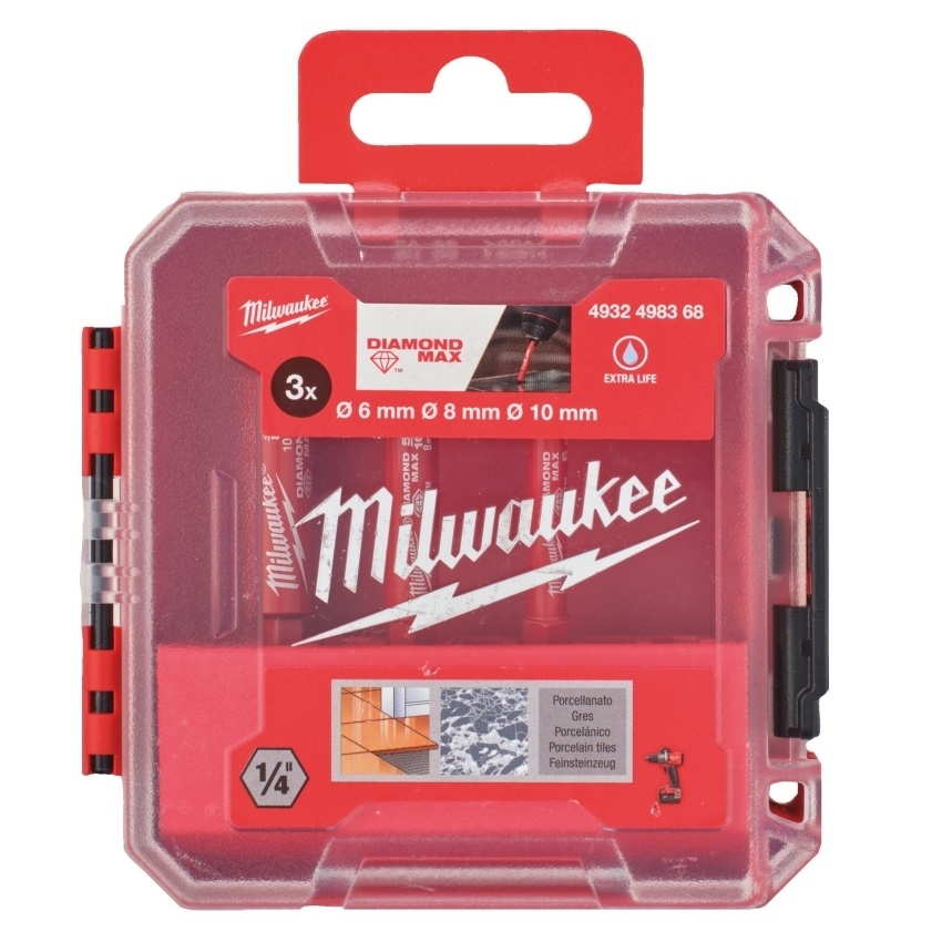 Sada Milwaukee Diamond Max vrtáků (3 ks) je speciálně navržena pro profesionály k vrtání do tvrdých materiálů, jako je porcelán, kamenina, kamenné desky, litina nebo skleněné vlákno, do nichž je obtížné vrtat tradičními vrtáky. Tyto diamantem potažené vrtáky a kruhové pilky poskytují vynikající výkon a dlouhou životnost při práci s těmi nejtvrdšími materiály.