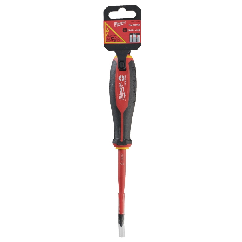 Šroubovák VDE Milwaukee Tri-Lobe PH/SL testováno na 10 000 V a zaručeno na 1 000 V. Tenký průměr dříku pro přístup k nízko položeným šroubům.