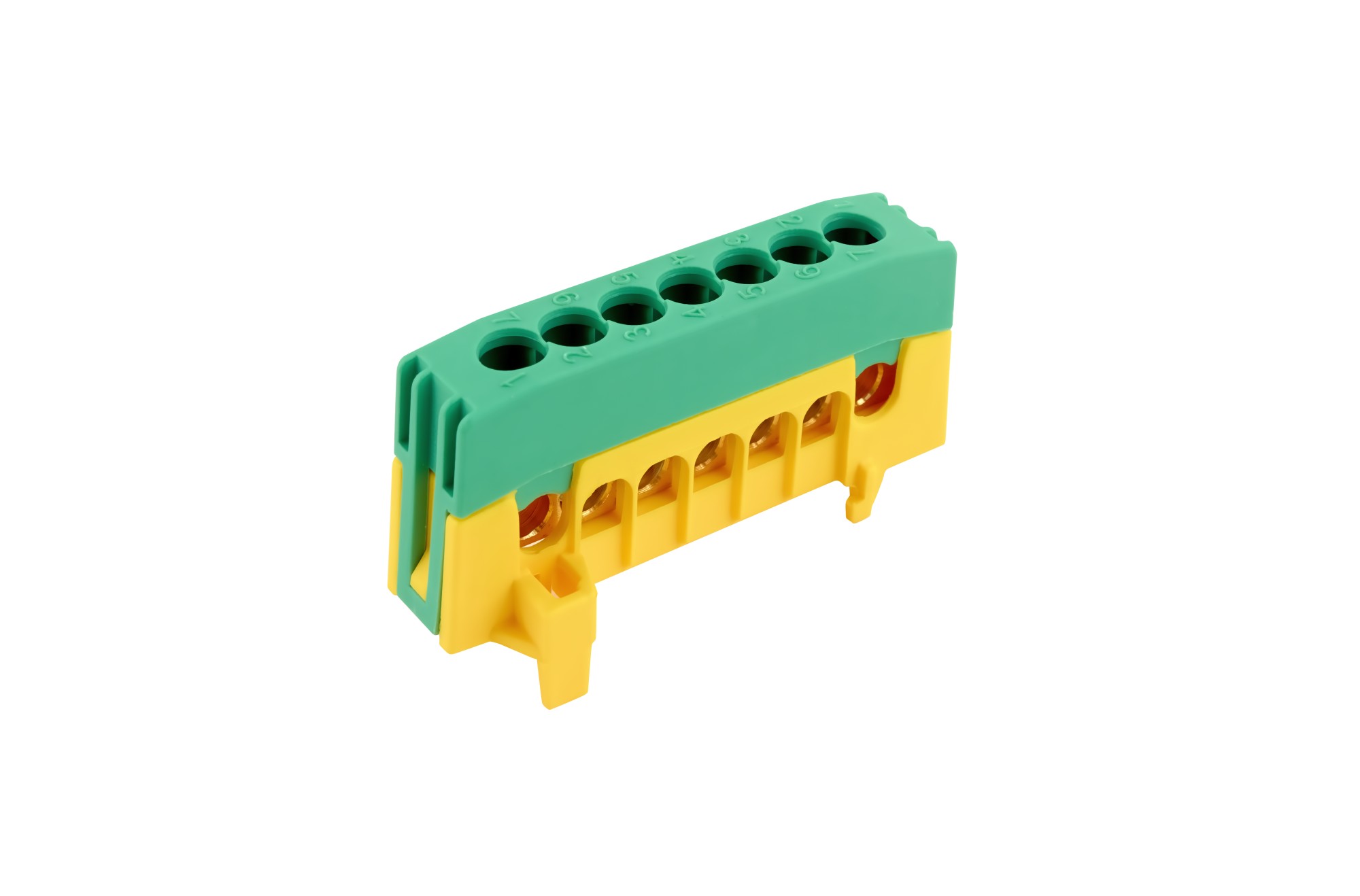 Můstek krytý, počet otvorů: 7, 1,5 až 16mm2, 230V-63A, rozměry: 60x27x12mm, zeleno-žlutý 10ks/bal. instalace na DIN lištu.