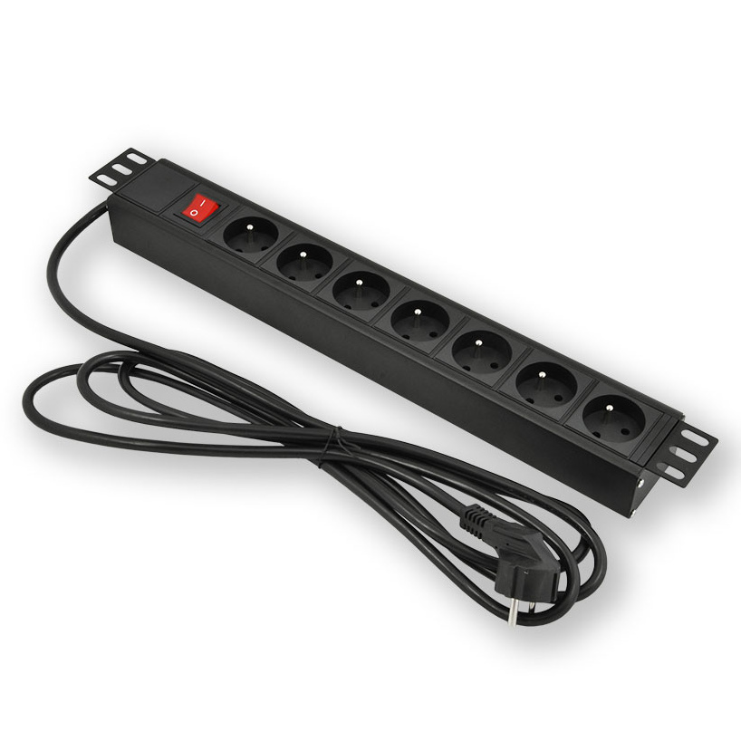 Rozbočovací napájecí panel pro instalaci do 19" datového rozvaděče k rozbočení napájení 7 zásuvkami 230V se zemnícím kolíkem NF C61-314, výška 1U s výpínačem a přívodní kabel vidlice DIN49441, barva černá.