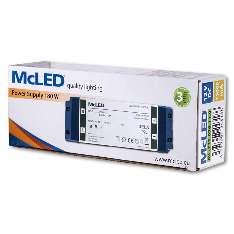 LED napěťový zdroj pro LED pásky 180 W, výstup DC 12V/15A. IP20. Vstupní a výstupní svorkovnice. Vstupní napětí 220 - 240V AC, materiál krytu: plast, barva bílá. Rozměry 205x71x35 mm, hmotnost 0,59 kg. Zdroj SELV, certifikáty: CE, RoHS, MM, F. Při výběru zdroje počítejte s výkonovou rezervou min. 20 %.