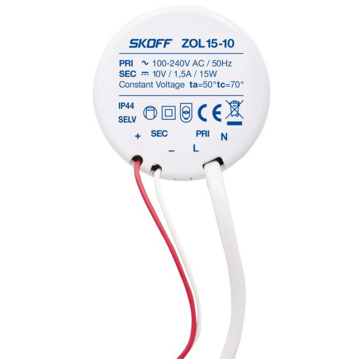 Napájecí zdroj ZOL 15 je impulsní transformátorový napájecí zdroj s výstupním napětím 10 V DC a jmenovitým výkonem 15 W. Zdroj je určený k napájení LED svítidel stejnosměrným napětím a je vhodný zejména pro produkty značky SKOFF (LED svítidel), které vyžadují napájení 10 V DC. Stupeň krytí IP 44 umožňuje použití zařízení venku nebo v místnostech s větší vlhkostí. Zdroj je chráněn proti stříkající vodě a proti vniknutí velmi drobných předmětů ≥ průměr 1 mm. Produkt je vybaven ochranným zařízením proti zkratu a proti přetížení. Je určený k přímé montáži v instalační krabičce.