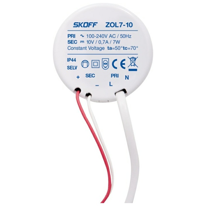 Napájecí zdroj ZOL 7 je impulsní transformátorový napájecí zdroj s výstupním napětím 10 V DC a jmenovitým výkonem 7 W. Zdroj je určený k napájení LED svítidel stejnosměrným napětím a je vhodný zejména pro produkty značky SKOFF (LED svítidel), které vyžadují napájení 10 V DC. Stupeň krytí IP 44 umožňuje použití zařízení venku nebo v místnostech s větší vlhkostí. Zdroj je chráněn proti stříkající vodě a proti vniknutí velmi drobných předmětů ≥ průměr 1 mm. Produkt je vybaven ochranným zařízením proti zkratu a proti přetížení. Je určený k přímé montáži v instalační krabičce.