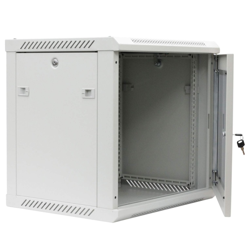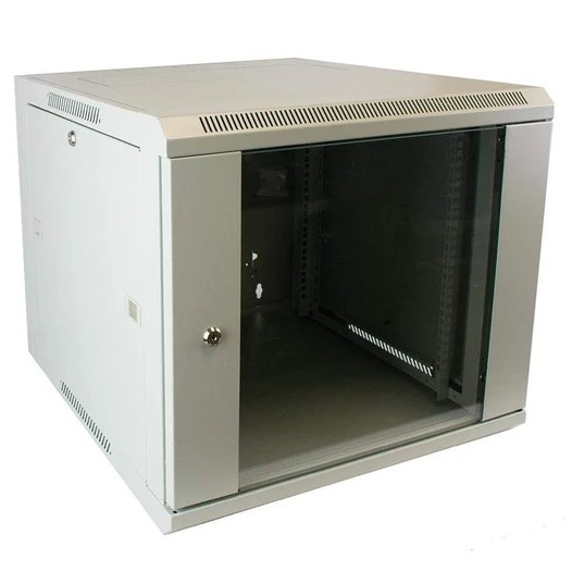 19“ nástěnný datový rozvaděč se skleněnými dveřmi, dodávaný ve smontovaném stavu. Pevná svařovaná konstrukce, skelet z ocelového plechu, šedá prášková barva. Skleněné dveře umožňují okamžitý přehled o stavu zařízení uvnitř rozvaděče. Vhodné pro malé sítě nebo koncová místa velkých sítí.