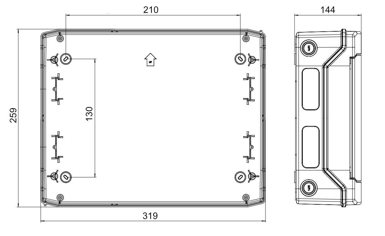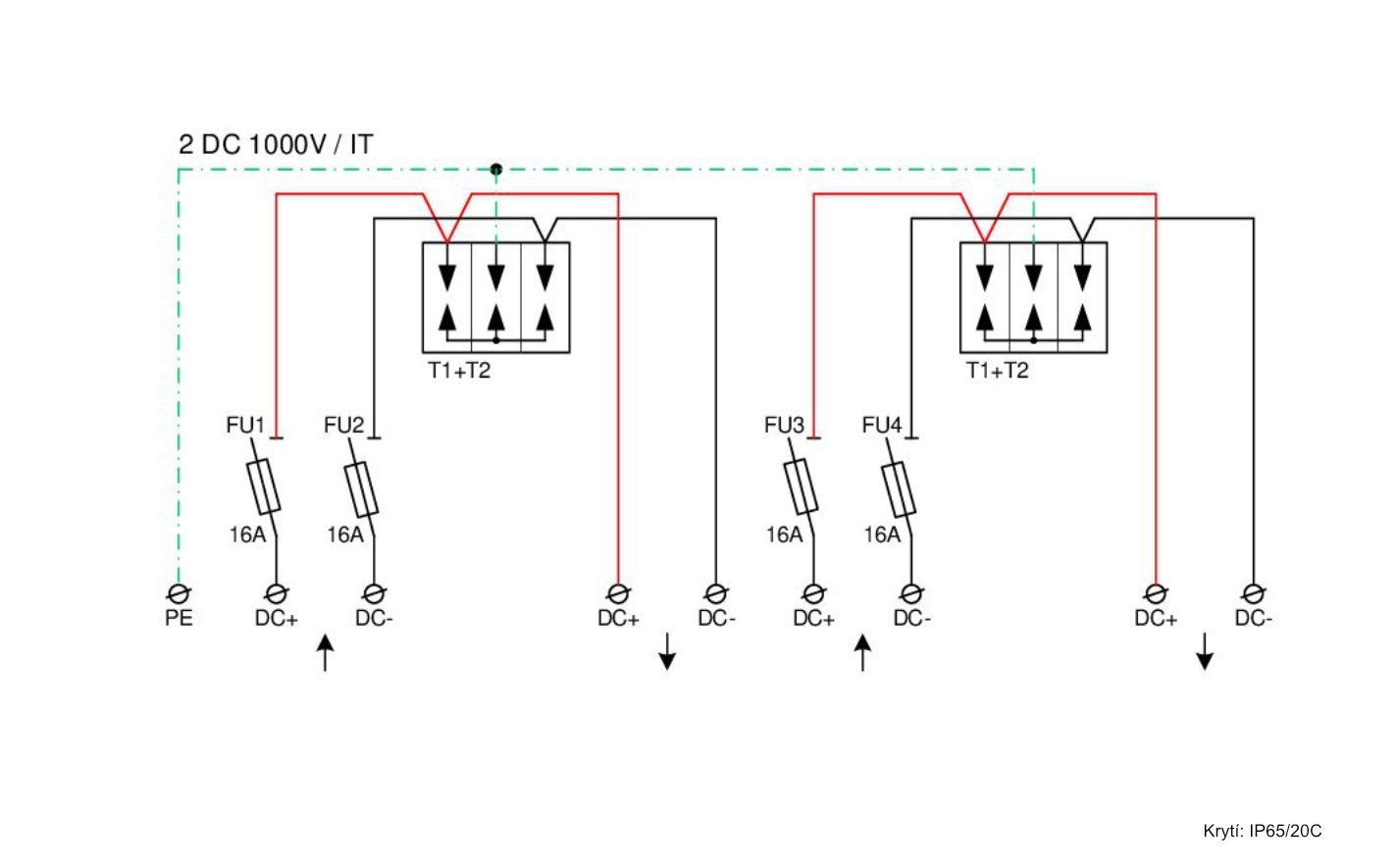 Fotovoltaický rozvaděč pro 2 stringy, ochrana DC vedení o max. napětí 1000V. Proud 16A, napětí 1000V DC, stupeň ochrany krytem IP65.