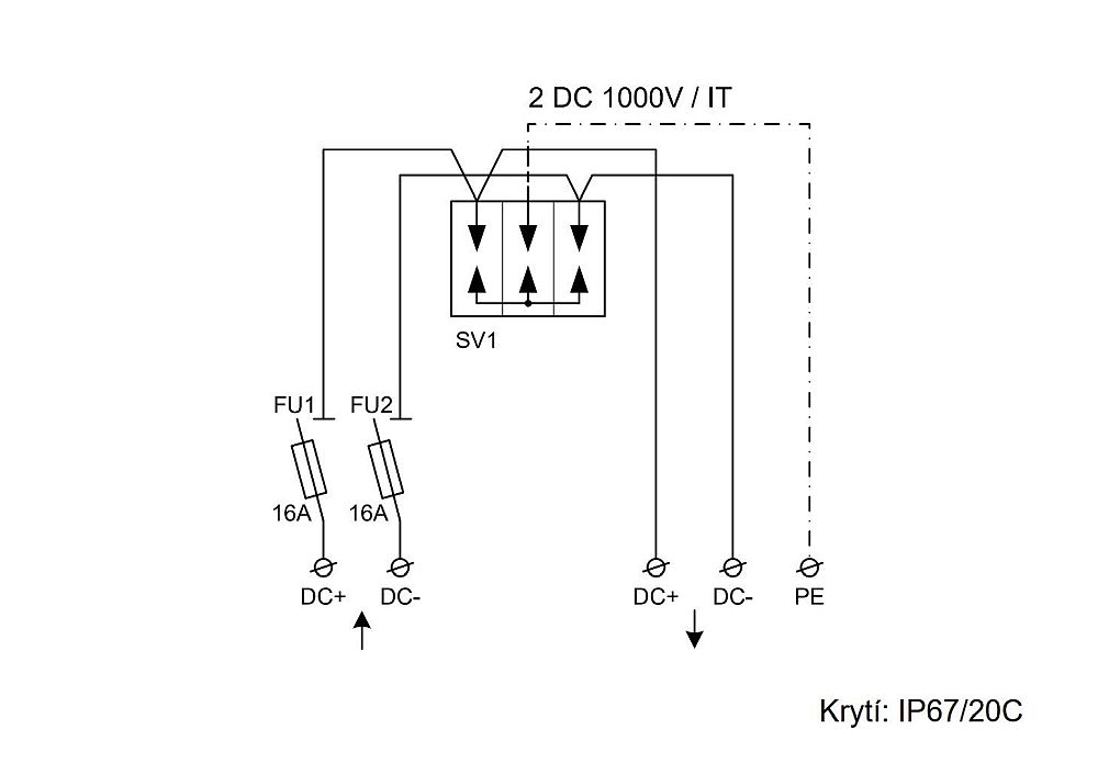 Pojistkový odpojovač: 1x DC, 2-pól., In=32A, Un=1000V DC, včetně pojistek 16A (10x38 mm)